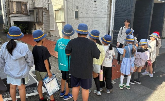 初日は防災授業とまち歩きを行い、1週間後に逃げ地図作りワークショップを実施した。実際にまちを歩き、現状を目にすることで、浸水や道路閉塞の危険性についての理解が深まった。